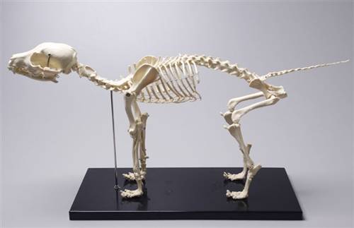 MODELO DE ESQUELETO DE CACHORRO para ensino, montado em suporte, com cabeça móvel.