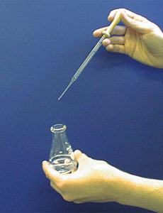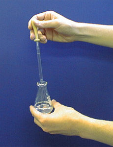 Nunca segure uma pipeta pasteur de vidro cheia de cabeça para baixo ou horizontalmente. Se você segurar dessa maneira, o líquido entra no bulbo, o que significa: